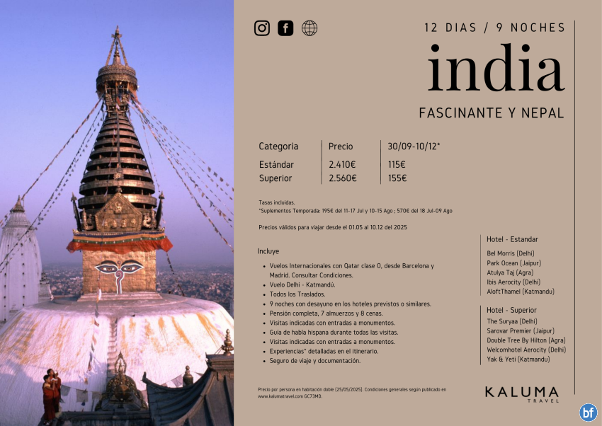 Fascinante India y Nepal 12 días/9 noches en *Pensión Completa y Experiencias* hasta Diciembre desde 2.525 €
