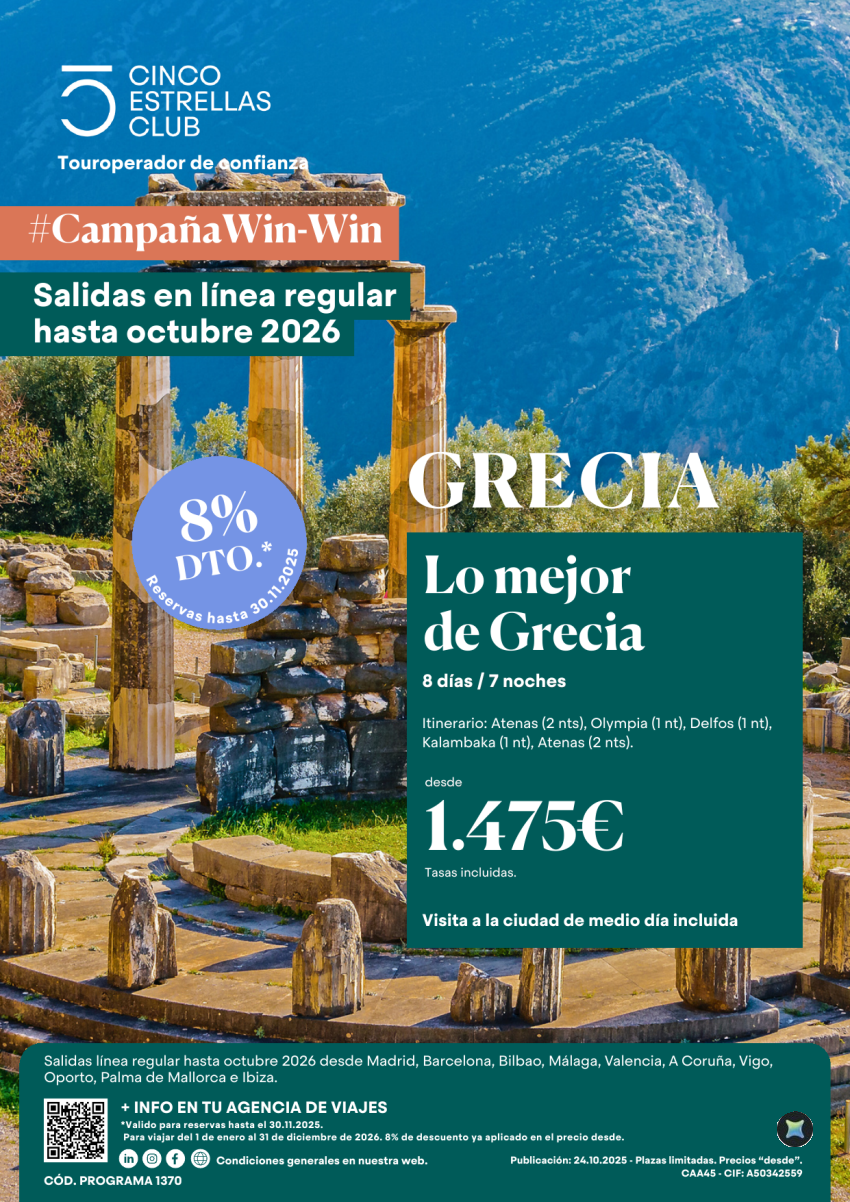 Win Win 8% dto.+ tjta Lo Mejor de Grecia 8ds/7ns dsd 1.475€ sal. dsd Mad,Bcn,Bio,Agp,Vlc,Lcg,Ovd,Opo,Pmi,Ibz