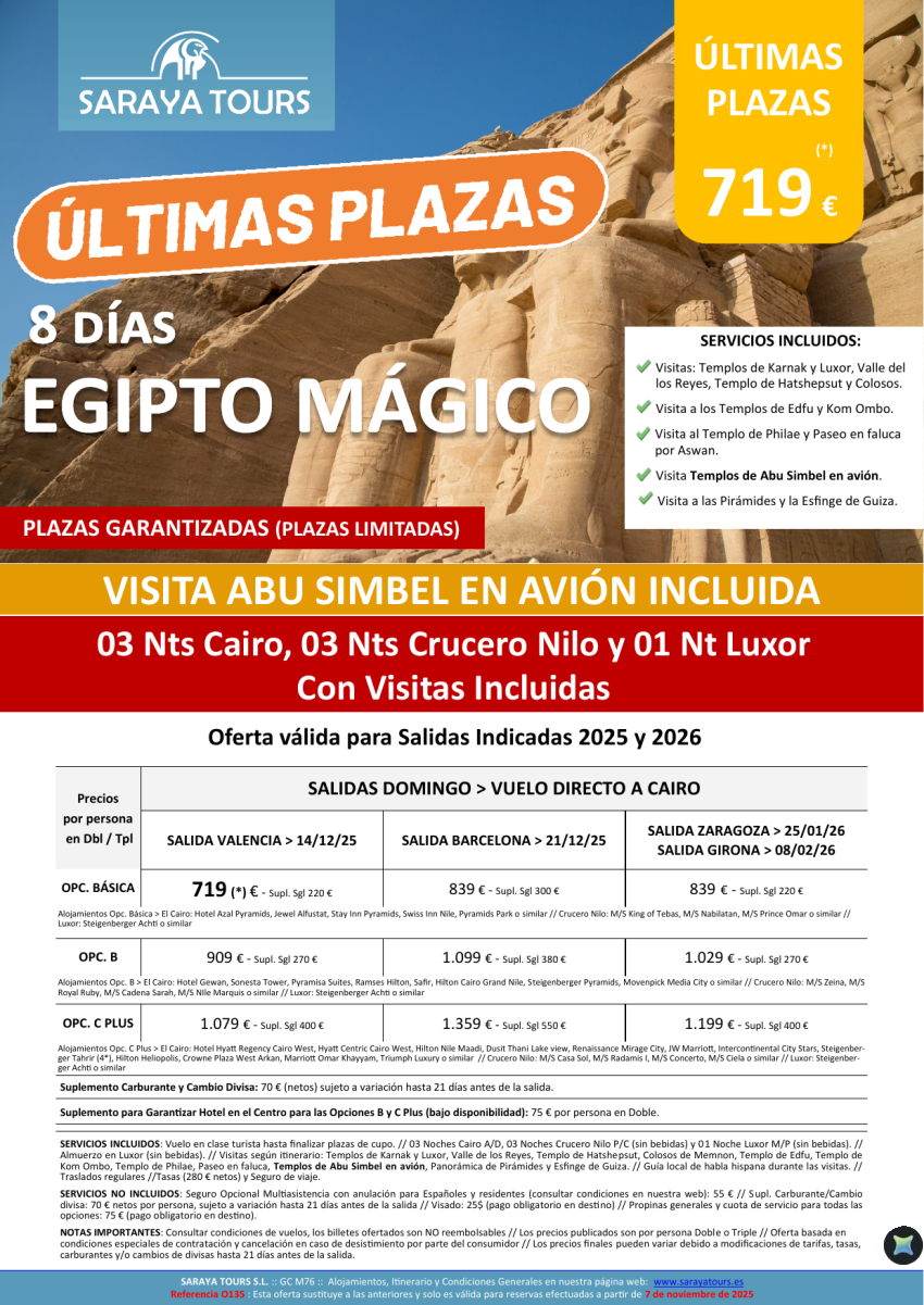 Últimas Plazas Egipto Mágico con Abu Simbel en avión Incluido dsd Vlc, Bcn ,Zaz & Gro. Consultar fechas.