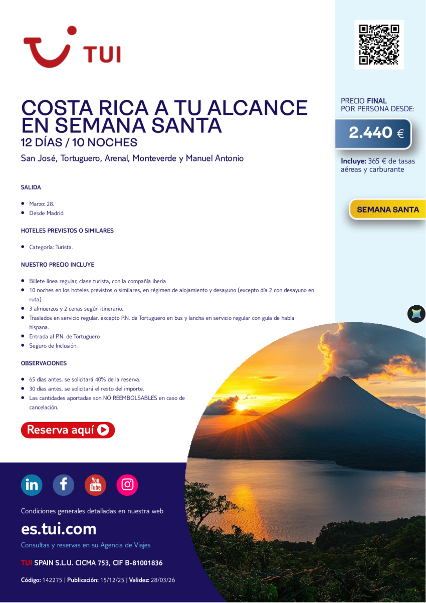 Costa Rica a tu alcance en Semana Santa. 12 días / 10 noches. 28 MAR desde MAD desde 2.440 €