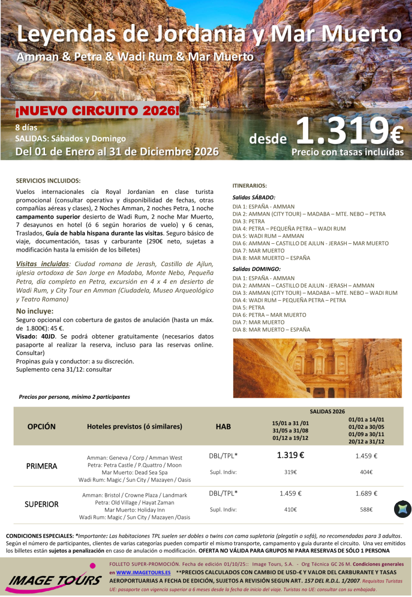 Nuevo programa Leyendas de JORDANIA *circuito Premium* con Petra, Wadi rum y relax en Mar Muerto, dsd 1.319€