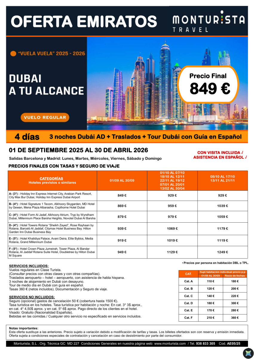 DUBAI a TU Alcance *** desde 849€ - 4 días: 3 noches Dubai en AD + Traslados + Tour Dubai con Guía en español