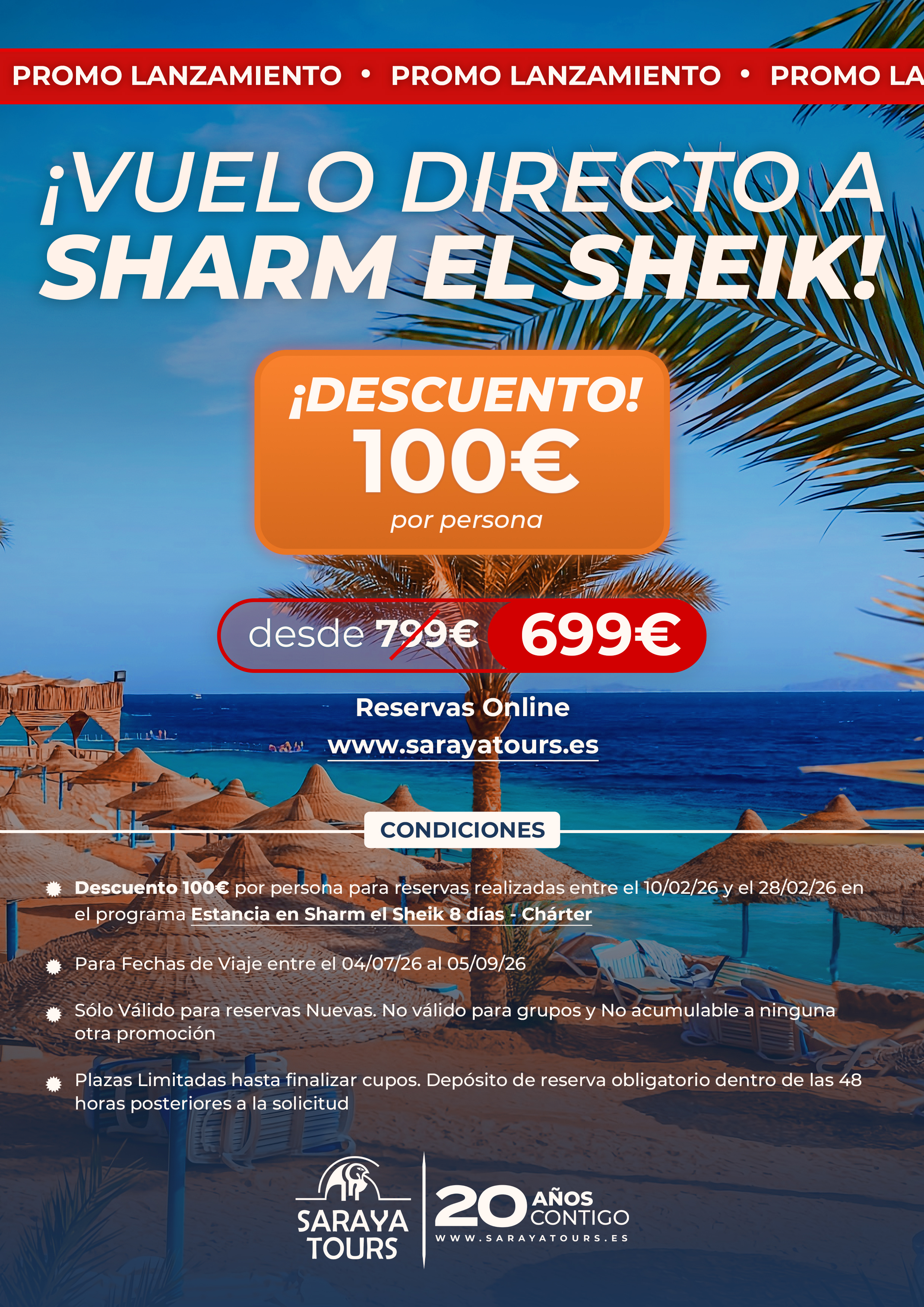 ¡¡ Promo Lanzamiento Vuelo SHARM !! Descuento 100 € p.persona. Salidas 04/07 a 05/09. Consultar condiciones.
