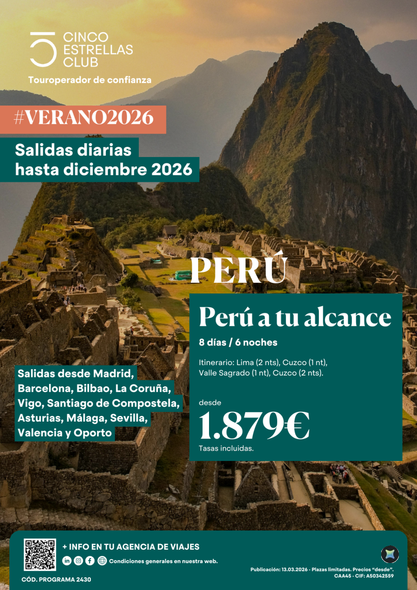 Perú a tu Acance 8ds/6n dsd 1.879€ sal. diarias hsta dic'26 dsd Mad,Bcn,Bio,Lcg,Vgo,SCQ,Ovd,Agp,Svq,Vlc,Opo