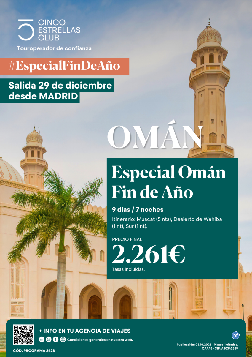 Cupos|Esp.Fin Año Oman dsd 2.261€ 9d/7n sld 29 de diciembre dsd Madrid