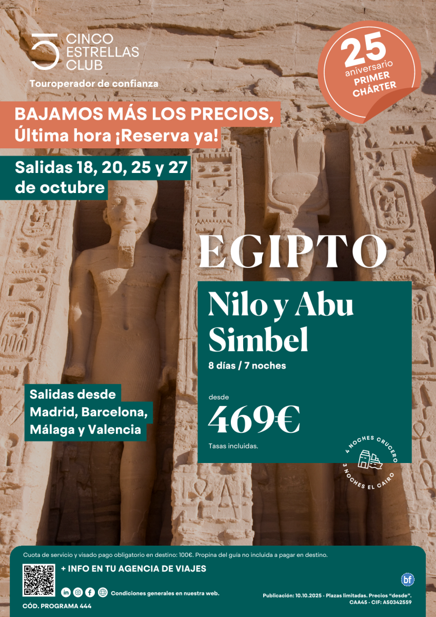 Bajamos más los precios Nilo y Abu Simbel 8ds/7n dsd 469€ sal 18,20,25 y 27 de oct. dsd Mad,Bcn, Agp,Vlc