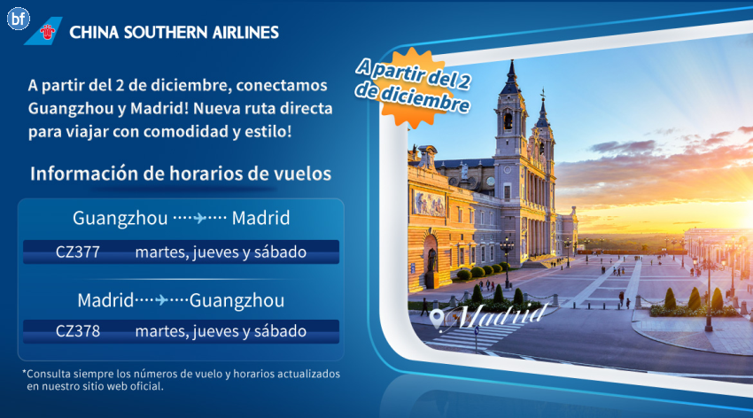 Nueva ruta directa entre Madrid y Guangzhou. ¡A partir del 2 de diciembre!