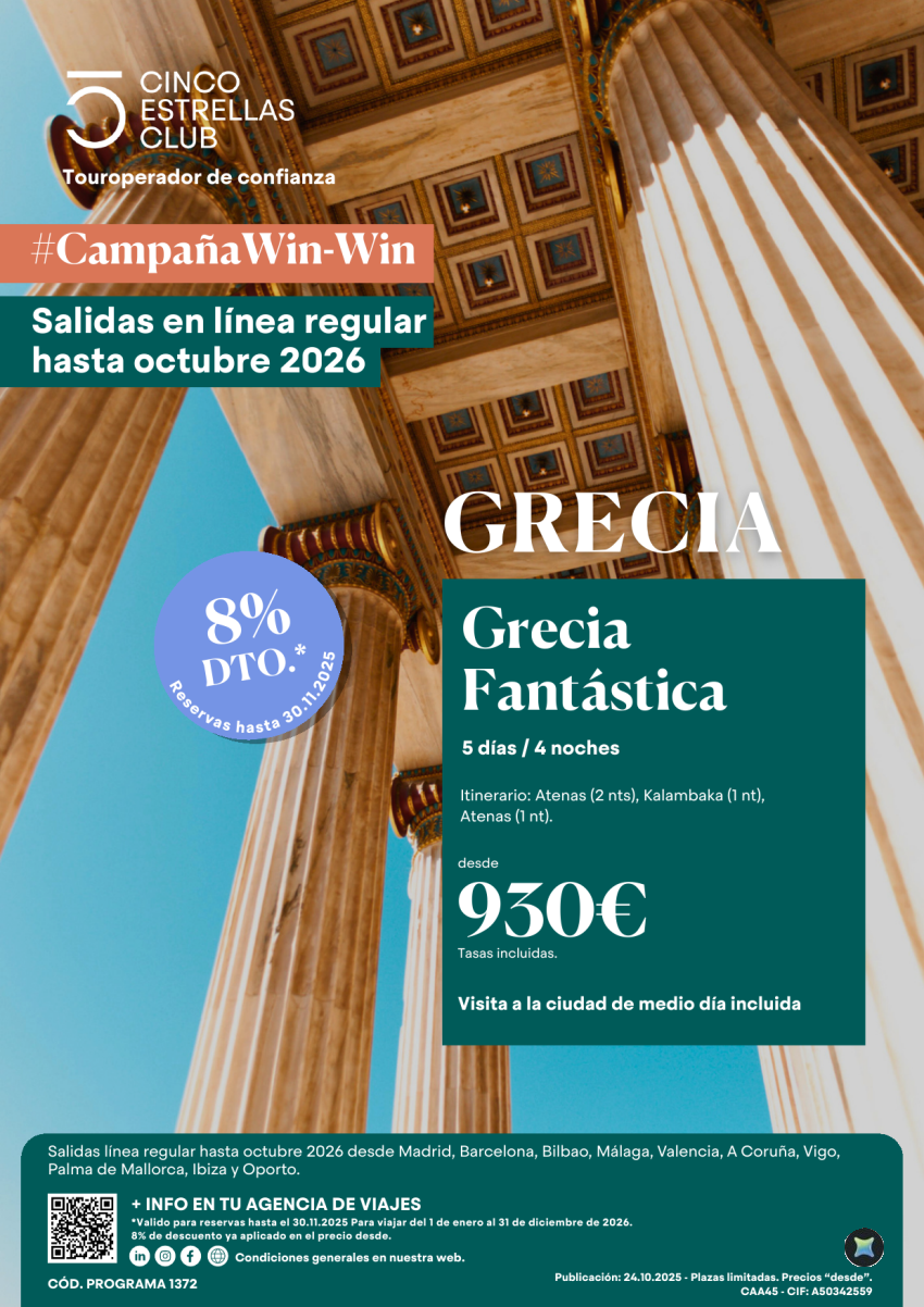 Win Win 8% dto +Tjta Grecia Fantástica 5ds/4ns dsd 930€ sal. dsd Md.Bcn,Bio,Agp,Vlc,Lcg,Ovd,Pmi,Ibz y Opo