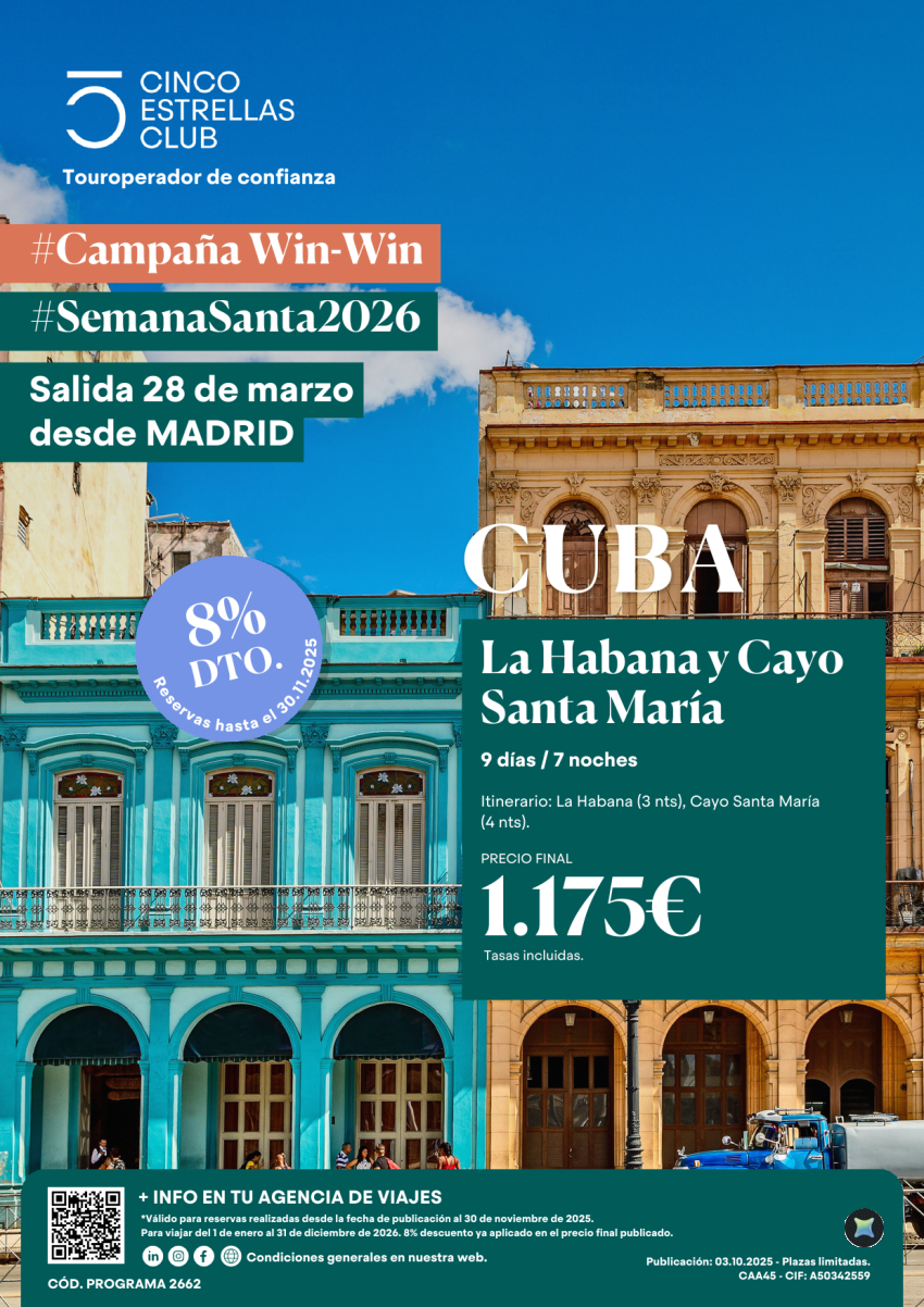 WinWin 8%dto hsta 30.11. Semana Santa Habana y Cayo Santa Maria PVP 1.175€ 9d/7n salida 28 de marzo dsd Madrid