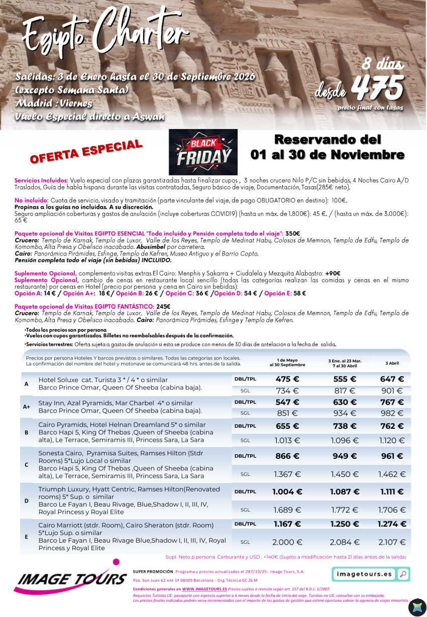 Egipto Charter (salida viernes) BLACK FRIDAY hasta septiembre 2026 ¡8 días con plazas garantizadas! desde 475€