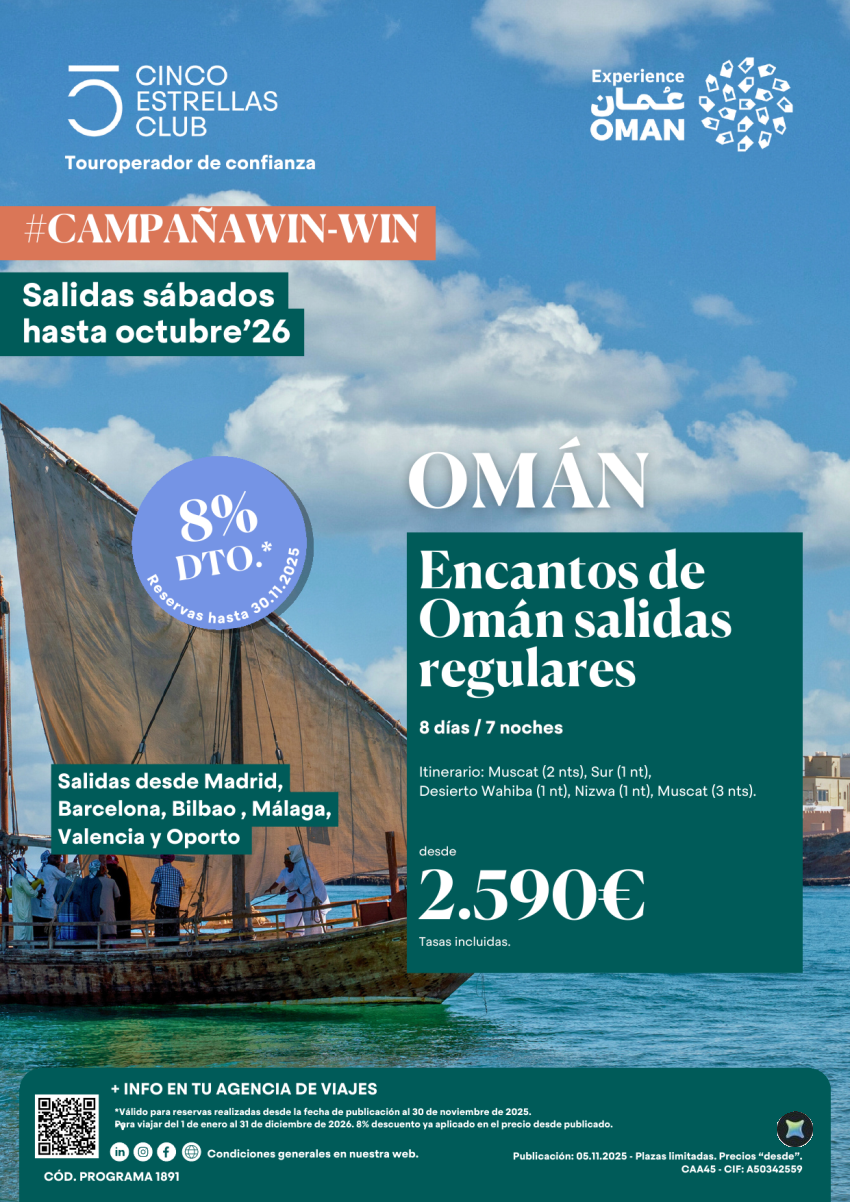 Win Win 8% dto hsta 30.11 Encantos de Omán 8 ds/7ns dsd 2.590€ sal. hsta oct'26 dsd Mad,Bcn,Bio,Agp,Vlc,Opo