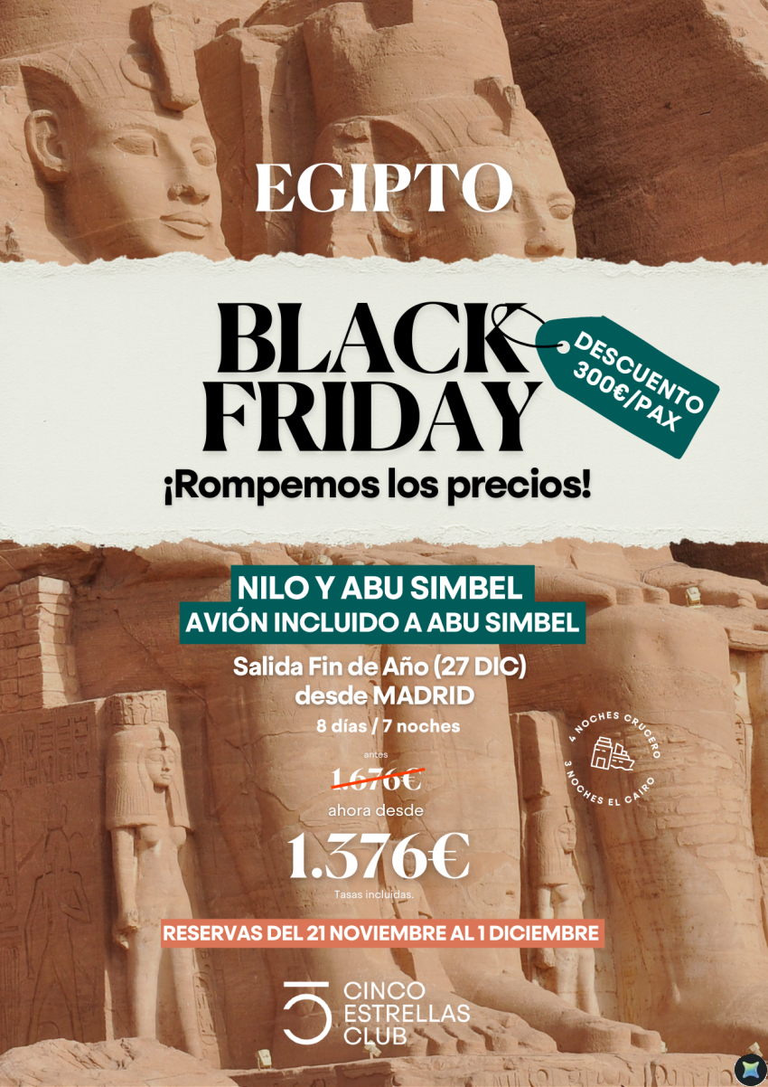 Black Friday -Dto. 300€ Nilo y Abu Simbel avión incluid Abu Simbel 8ds/7ns sal. 27. 12 pvp 1.376€ dsd Madrid