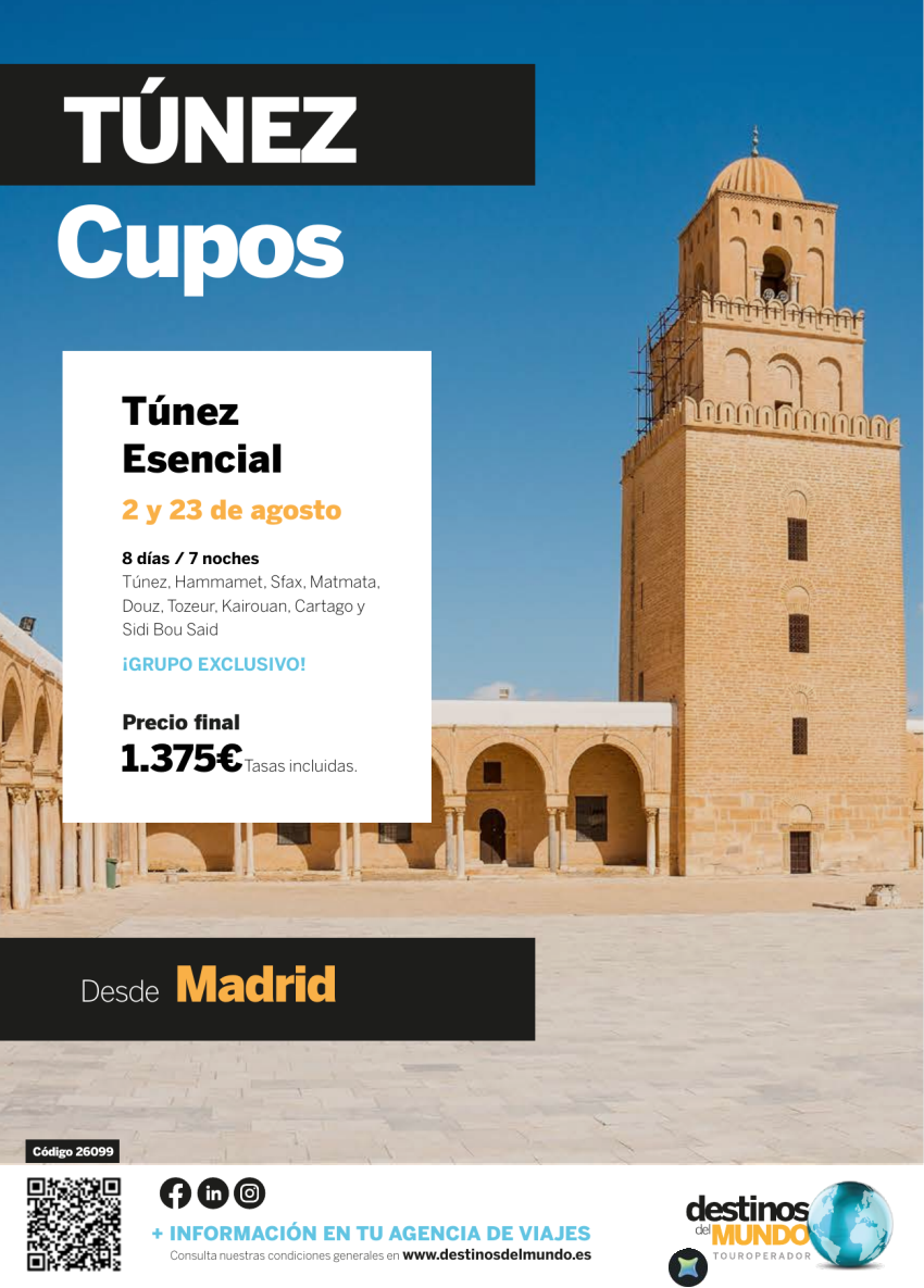 🇹🇳☀️🐪Túnez esencial CUPOS VERANO 8 d / 7 n origen: Madrid salidas: 02 y 23 de agosto 2026 desde 1.375€ 🇹🇳