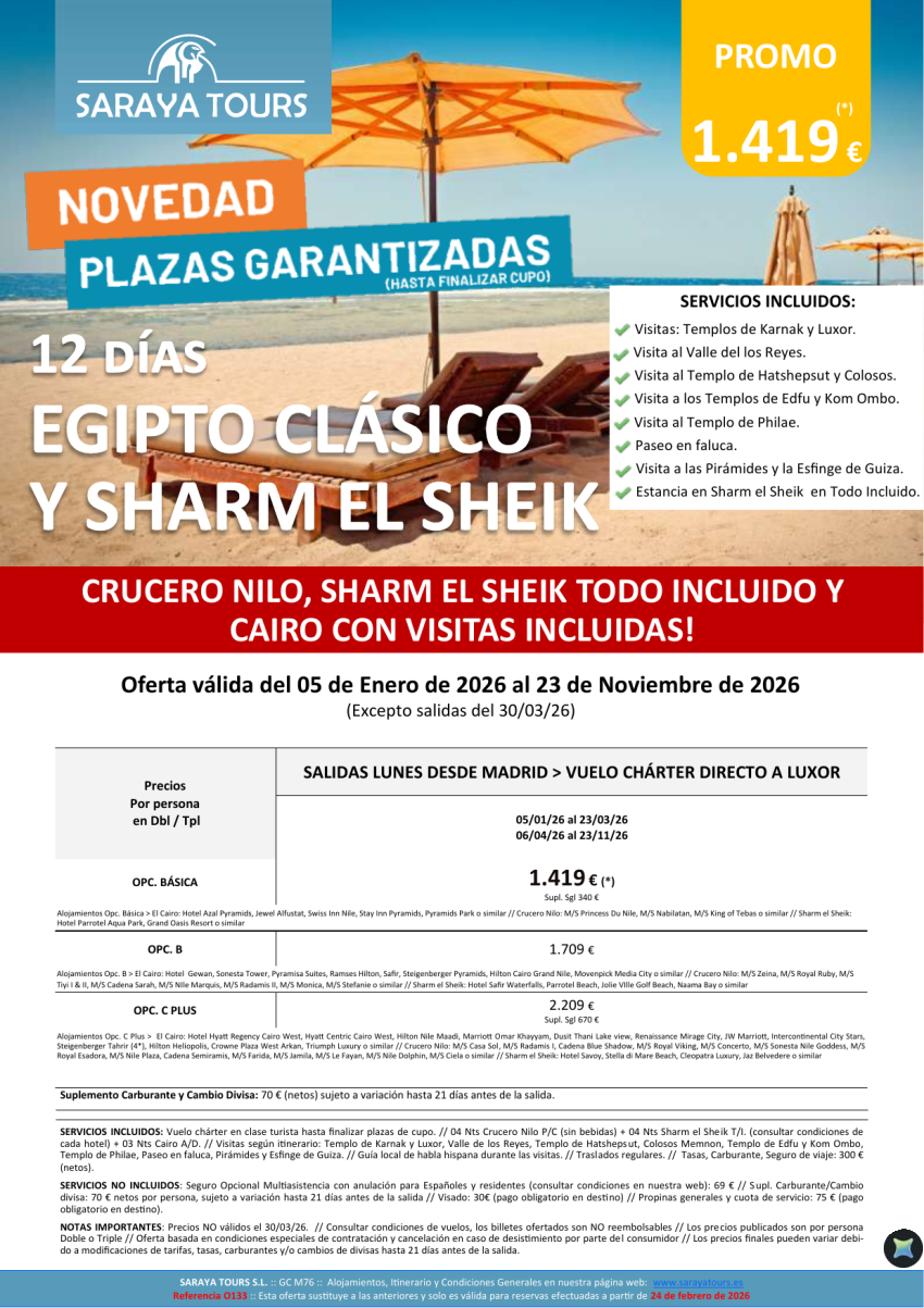 Egipto Clásico y Sharm el Sheik 12días * Vlo charter Madrid * Crucero Nilo+Sharm el Sheik+Cairo. Hasta Nov 26